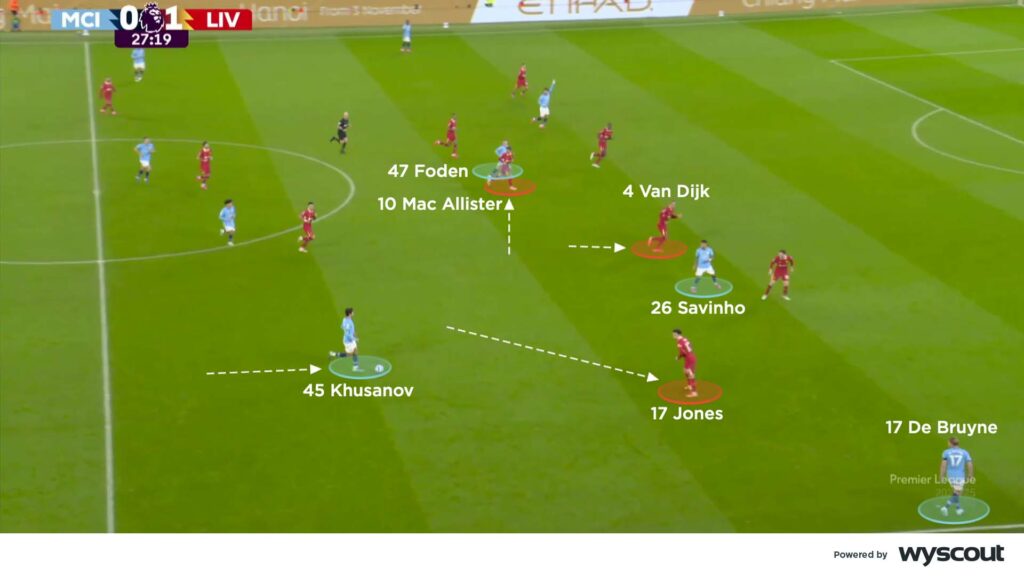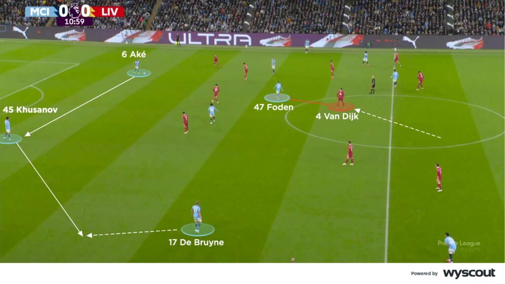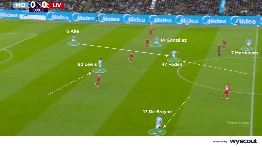 Neither side set up with a recognised centre-forward, meaning that dropping movements from their respective front lines helped to progress the play. From City’s 4-1-4-1 shape, Phil Foden dropped to receive, taking advantage of central spaces made bigger by the widening positions of number eights, Marmoush and Kevin De Bruyne. Rico Lewis inverted from right-back, joining pivot Nico González, which helped occupy central players in Liverpool’s front line and free access to the dropping Foden (below).