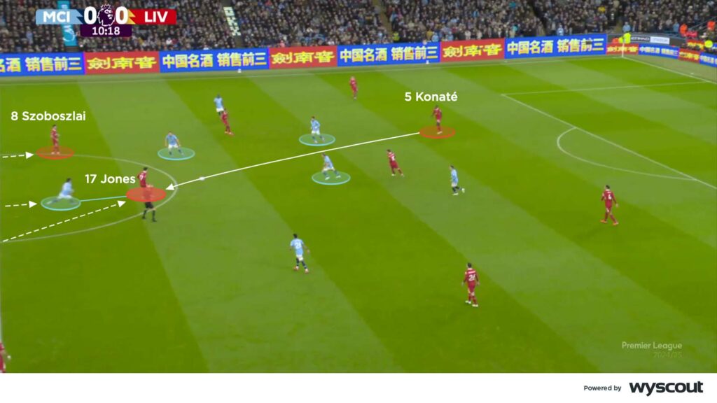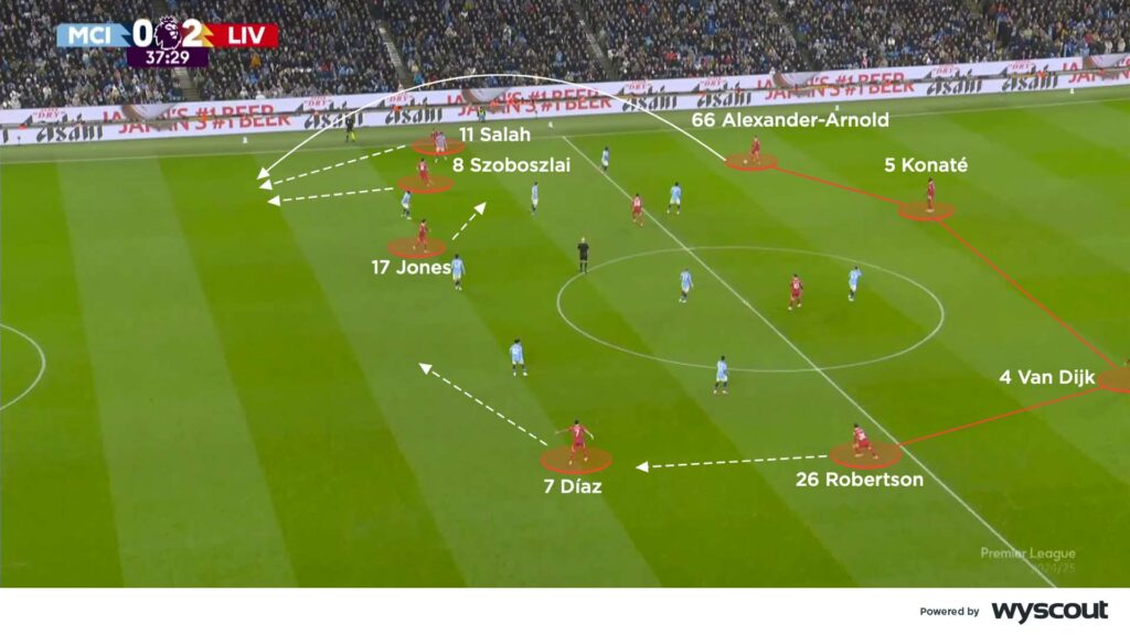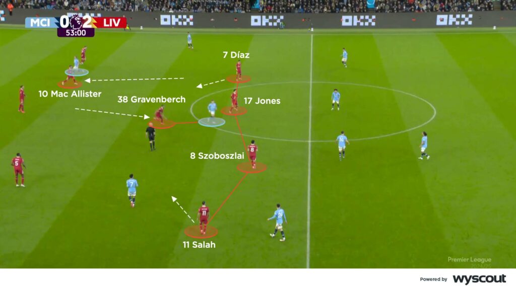 Liverpool utilised a 4-2-4 structure in possession, and like City they also deployed dropping central forwards – Jones and Szoboszlai moved towards the ball to initially overload City’s midfield trio. When City committed a centre-back to press into midfield, Liverpool faced a similar problem to the one they posed City. Slot’s side, however, had two players dropping centrally, meaning they could combine with one another when needed (below). They also had more purposeful passing, forward runs and overall attacking play from Salah and Díaz coming inside from wide – especially when exploiting City’s advancing centre-back.