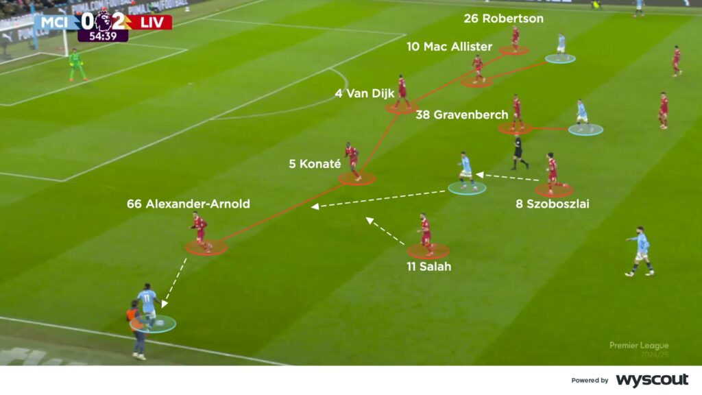 When Alexander-Arnold was faced with defending 1v1 against Doku, Gravenberch moved across to provide additional support. On this side, Salah and Szoboszlai also worked back to cover passes back inside (below), forcing City to play forward passes into congested central spaces.