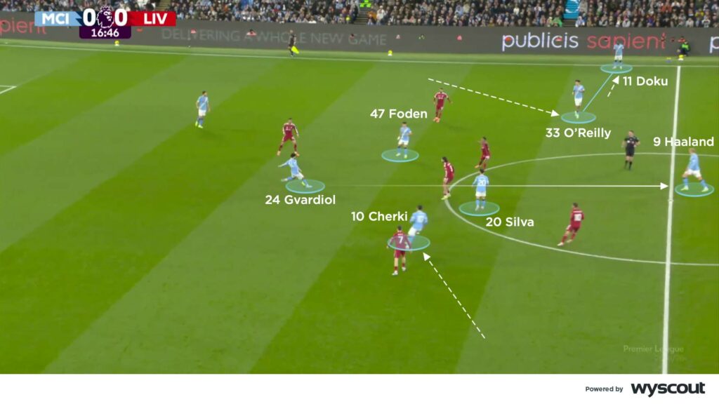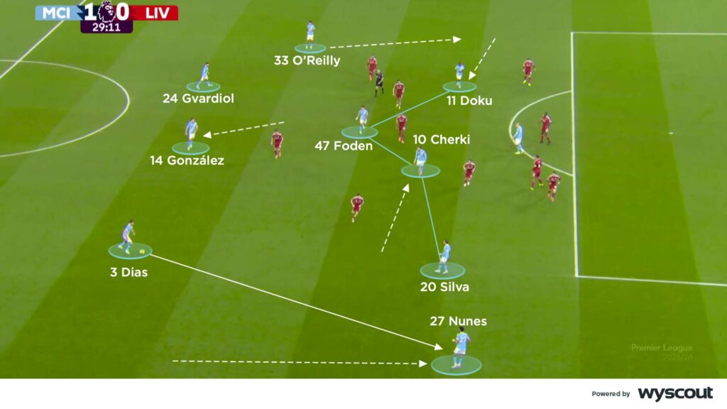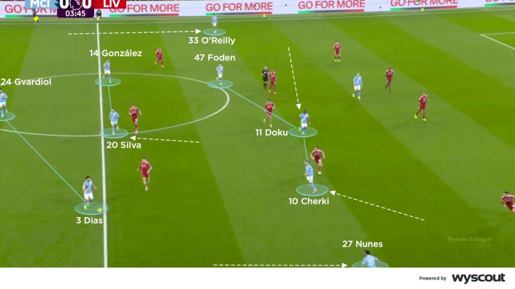 Although Liverpool responded by narrowing their 4-2-3-1 block when defending – with Mohamed Salah and Florian Wirtz tucked in – City still found ways through. They intelligently increased their speed of passing when playing into the central players, often after playing a few passes at a slower tempo. After drawing in and narrowing Liverpool, City then fed the play wide. Cherki continued to come in off the right, with most of City’s wide play coming on their left flank. There, Doku sometimes held the width to attack 1v1 against Conor Bradley, as O’Reilly moved inside and maintained City’s central numbers (below).
