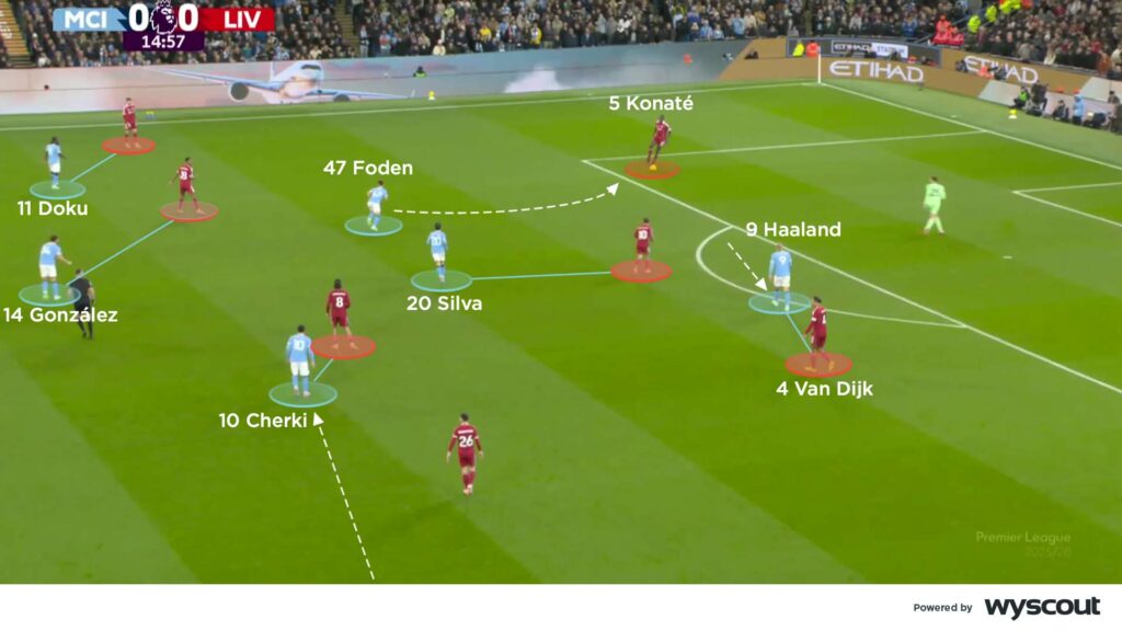 Another impressive aspect of City’s first-half performance was the pressing trap they set on Ibrahima Konaté, especially from Liverpool goal kicks. Haaland immediately moved to the right and attached himself near Van Dijk, encouraging the play towards an initially free Konaté. Foden jumped out of midfield, cutting off any passes into Liverpool’s midfield via the inside channel. Cherki then moved across to make a three-player midfield for City (below), ensuring Liverpool had no free central midfielder to receive through the press.