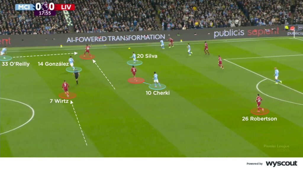 From their initial 4-3-3, Manchester City created significant central numbers as wide players Doku and Rayan Cherki moved inside to join Phil Foden, forming three central attackers. Full-backs Nico O’Reilly and Matheus Nunes then advanced to create the attacking width, with Bernardo Silva dropping alongside González as two pivots ahead of the centre-backs (below). This gave the home side an overload to build against Liverpool’s midfield three, and long spells of attacking possession in the early stages of the game.