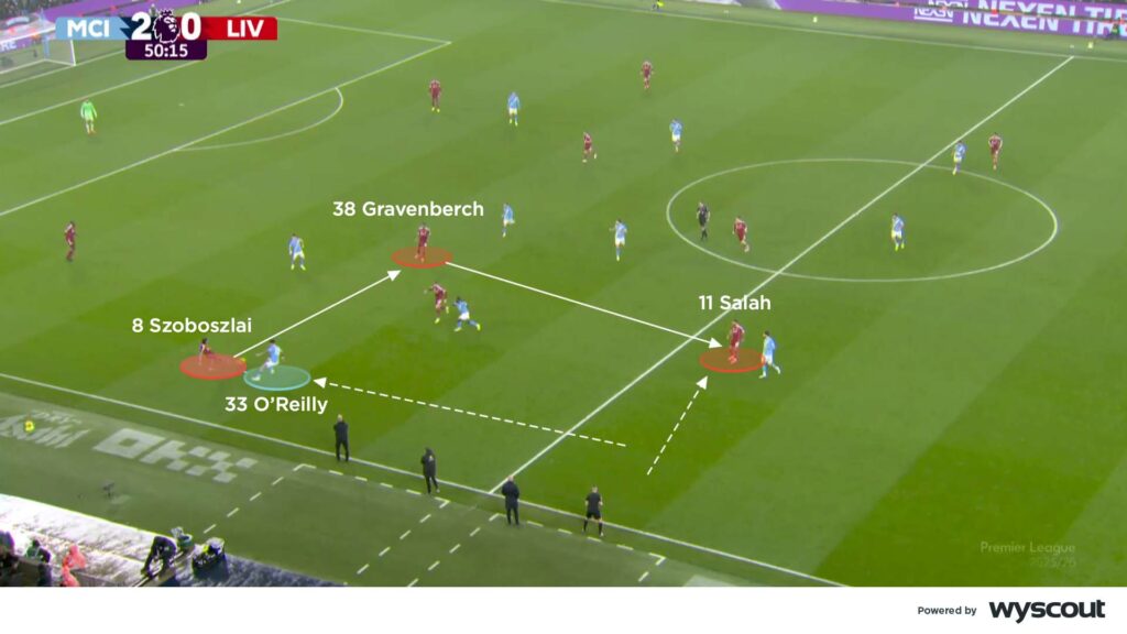 Liverpool improved in the second half, with their highest central midfielder Dominik Szoboszlai moving wider, rather than Ryan Gravenberch or Alexis Mac Allister. The Hungarian managed to connect back inside as O’Reilly continued to jump out of City’s back line. At the same time, Salah sometimes narrowed to receive these central passes (below). Although he was easier to mark for City’s centre-backs, he was now receiving better, angled passes into his feet, as opposed to the more hopeful long balls of the first half.
