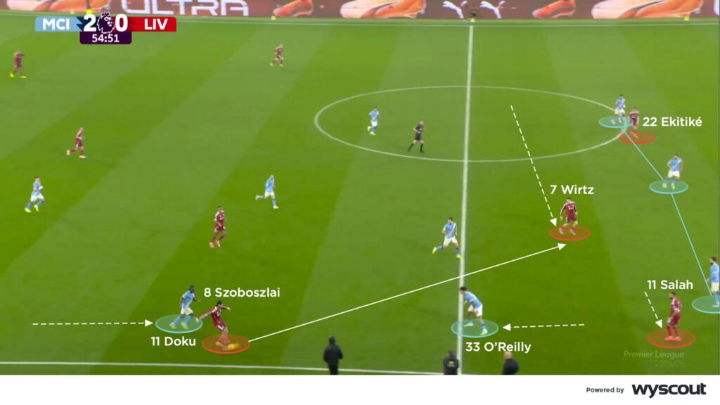 When Doku back pressed and tried to limit Liverpool connecting inside, Wirtz’s positioning from the left was even more aggressive in moving across. This allowed Salah to stay wide, occasionally, which gave Liverpool some 3v3 moments (below) where they progressed into the final third with much more attacking control.