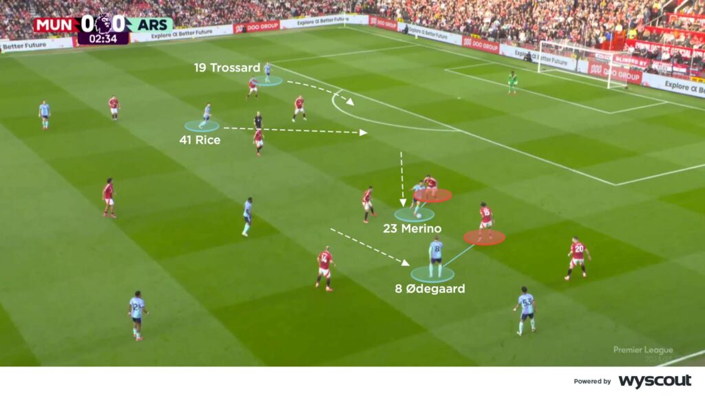 Manchester United defended in a low block from the first whistle, with Arsenal in a 4-3-3 trying to break them down. The visitors dominated both the ball and territory throughout the first half, probing most with their inside-channel combinations. Martin Ødegaard drifted wider, which helped lure out Lenny Yoro, while dropping centre-forward Merino helped to pull Victor Lindelöf out of United’s back line. Rice and Leandro Trossard made runs in an attempt to exploit the resulting space (below), as Arsenal worked frequent shots, albeit from the edge of the penalty area.