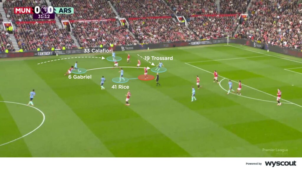 As the first-half progressed, Arsenal’s full-backs moved higher as the Gunners reverted to a back line of three. The result was that when Riccardo Calafiori moved high on the left, Trossard could move earlier into the inside channel. And when Matthijs de Ligt was occupied by an Arsenal player slightly deeper than Trossard, the away side found a method of penetrating through the left inside channel of United’s 5-2-3 block (below). But despite regularly progressing to the edge of the penalty area, tame shots from range and inaccurate final balls meant that Arsenal managed only two shots on target in the first half.