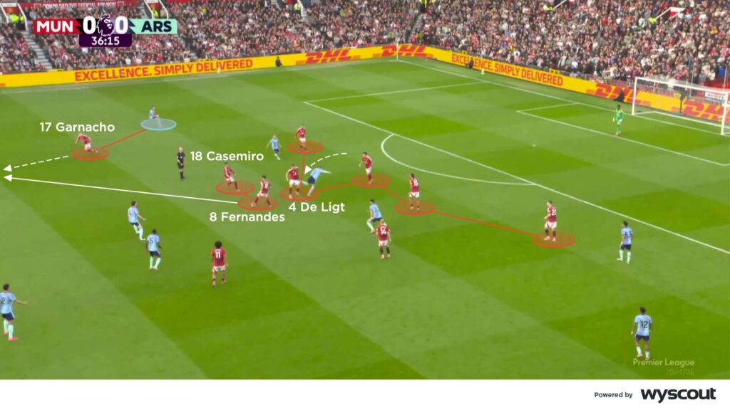 Defending with a low block and a back line of five meant that United resorted to rare and isolated counter-attacks from regains well within their own half. When their wide centre-backs regained possession after jumping into midfield – or supported successful duelling by double pivots Casemiro and Fernandes – they were able to spring counter-attacks. And with Calafiori getting forward more for Arsenal, Garnacho looked to exploit the space on United’s right, as their most effective outlet (below).