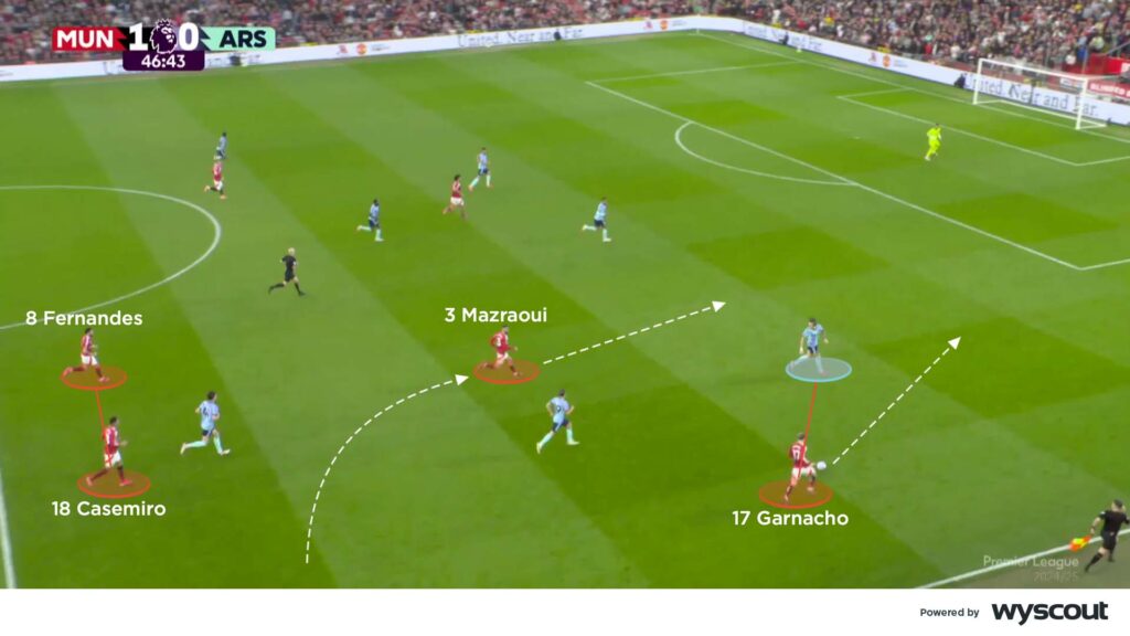In the second half, Garnacho drove United forward after midfield regains from Casemiro and Fernandes. With the narrowed Noussair Mazraoui supporting him, the right-side continued to give United their best attacking moments. Indeed, Garnacho’s 1v1 play against Calafiori – and later Myles Lewis-Skelly – provided a strong base to attack. Underlapping runs from Mazraoui – who defended narrow anyway against Trossard’s inward runs – further isolated Arsenal’s left-back against Garnacho (below).
