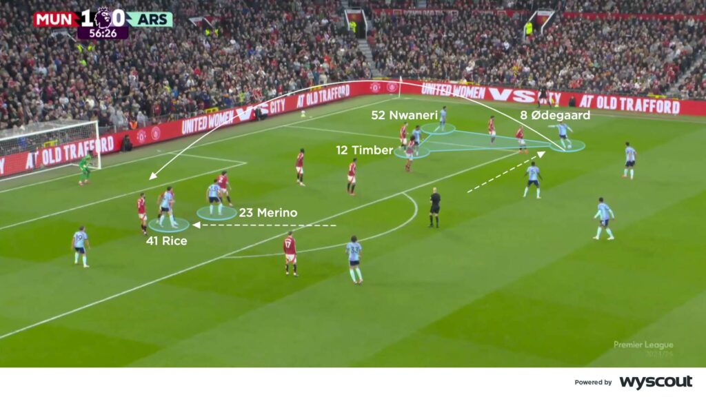 Arsenal delivered more crosses in the second half, especially from the right side, as Ødegaard combined with Ethan Nwaneri and Jurriën Timber from a very wide position (below). Rice joined Merino inside the penalty area as the main targets, but United often defended with 11 players back. This meant Arsenal needed another layer to their build-up prior to entering the penalty area. They lacked overlapping runs around the player on the ball, as well as unattached teammates arriving inside the box as the ball was delivered.