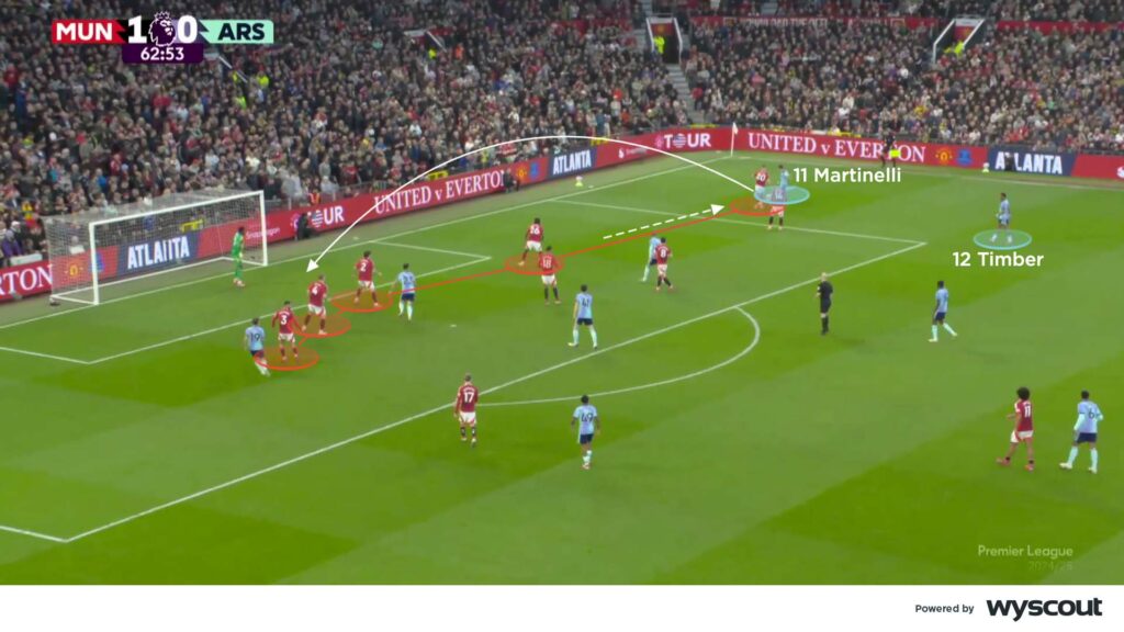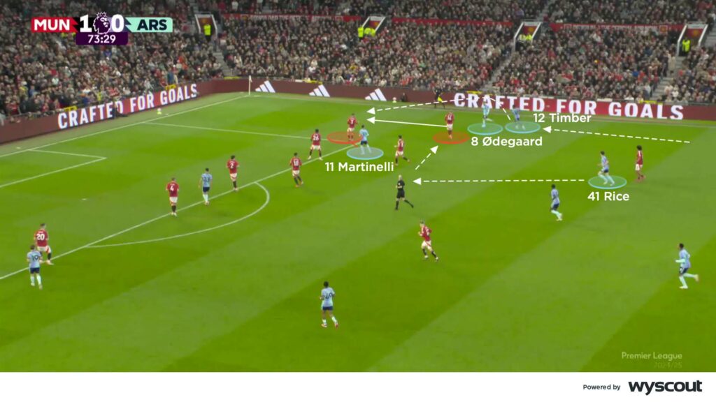When Arsenal found an equaliser it stemmed from their right-side attacks requiring additional defensive cover from United. In the 74th minute, Timber’s well-timed overlap around Ødegaard pulled United’s players further across. After smart work on the ball, Timber cut the ball back to the oncoming Rice. Rather than stand inside the box and be marked by United’s aerially dominant centre-backs, Rice arrived in the space vacated by United’s midfield (below). From there, he smashed home the equaliser.