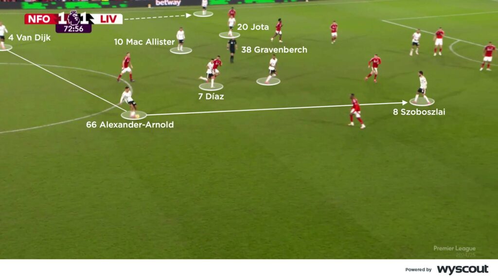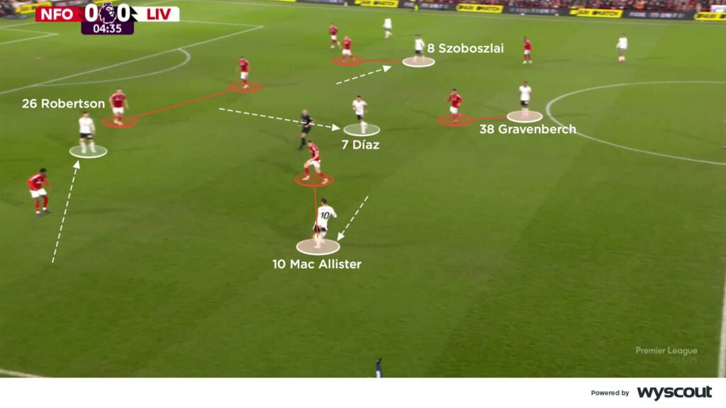 After half-time both Konaté and Van Dijk began to step into midfield for Liverpool and carry the ball forward, drawing Wood and Gibbs-White over to one side. Quick switches back across allowed whichever Liverpool centre-back was spare to drive forward and take the midfield spaces more aggressively. Gibbs-White was often the one to jump out for Forest, which meant he left Gravenberch. Liverpool then better connected into their central players (below), working the ball around and between the hosts’ deep centre-backs with much more purpose, as they penetrated the penalty area more frequently.