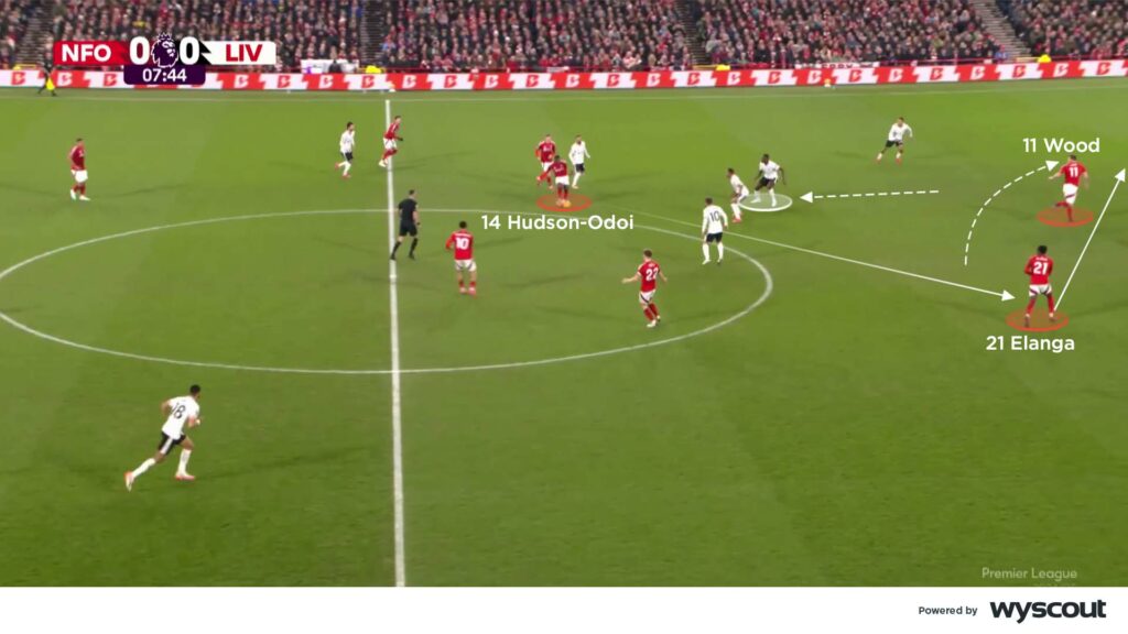 Although Forest did not add a second goal before the break, their longer play was well thought out. Elanga continued to move inside from wide right, ready to work off anything Wood could flick on or work into feet. Hudson-Odoi held his position on the left, but was ready to run in behind Trent Alexander-Arnold should play be worked to his side.