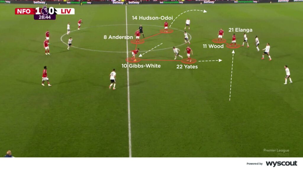 Meanwhile, Gibbs-White and Ryan Yates rotated in the central areas, especially during the first part of Forest’s longer build. This meant the more combative Yates could compete for second balls, while Gibbs-White was in an area with less pressure should Liverpool win the first contact. From there, he could find the adapted front pairing with his incisive passing (below), as Forest worked well off their long balls.