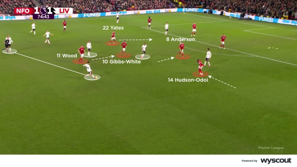Another benefit of Liverpool’s adjusted roles and attacking shape was that it allowed them to lock Forest in a much deeper block. This naturally increased the counter-attacking distances the home side had to cover to reach Liverpool’s goal. Forest’s front line took up increasingly deeper positions (below), often unable to get into the final third due to Liverpool’s impressive recovery runs and transitional defending. In moments when Forest looked to have broken forward, Liverpool’s tactical fouling and resolute defending helped to limit Forest to just one effort on target in the second half.