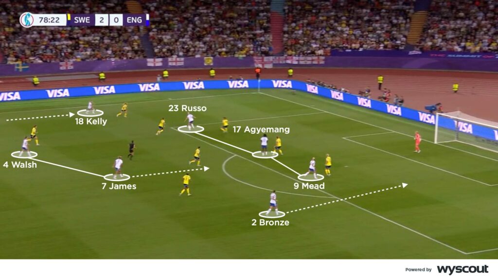 It still took a significant restructure for England to level the game, however. Wiegman added Michelle Agyemang, Chloe Kelly and Beth Mead to the attack, changing England to a 3-4-3 in possession. Kelly attacked from the left, providing fantastic inswinging crosses for the central numbers to attack. Bronze, meanwhile, continued to move high from right-back and provided width. Russo, Agyemang and Mead formed a narrow attacking trio to attack the box, but also linked short and long passes as England threw numbers forward. James, meanwhile, dropped deeper to form a double pivot alongside Walsh, but still had licence to run and dribble forward.