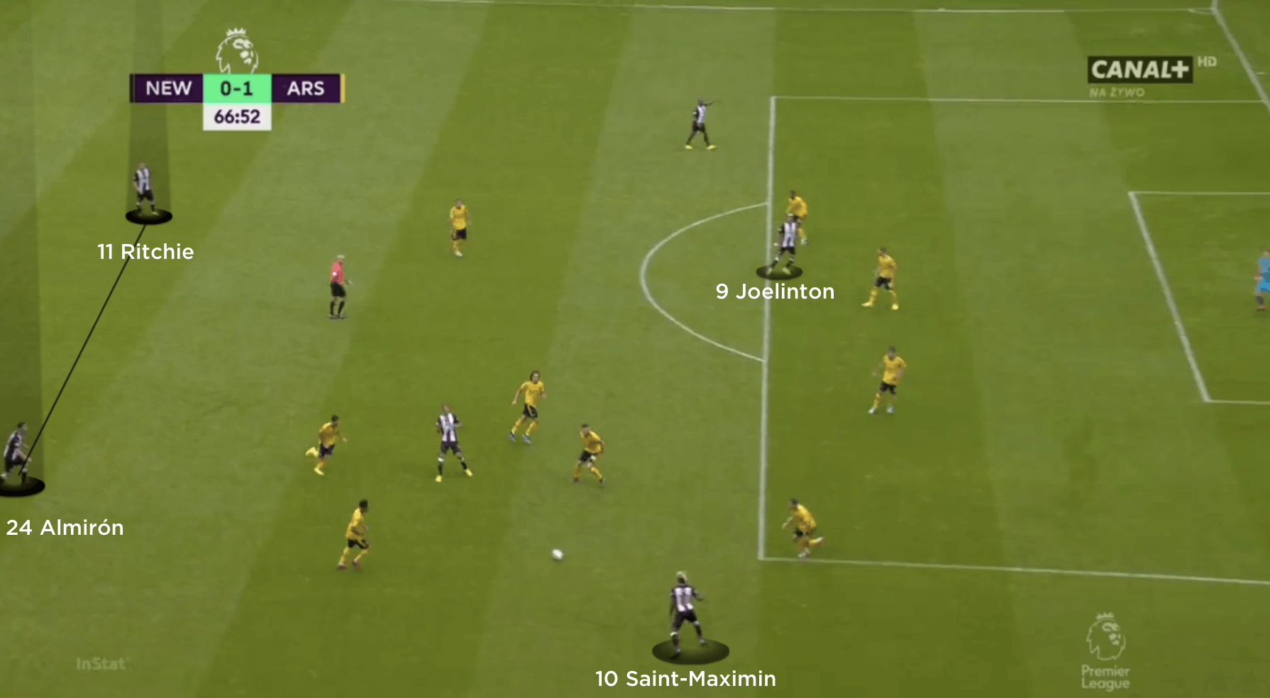 For the first competitive fixture of Steve Bruce’s reign as Newcastle United manager, he organised his team into a 3-5-2 led by new signing Joelinton alongside his predecessor as the club’s record buy, Miguel Almirón. The latter dribbled horizontally across the pitch in an attempt to tempt Arsenal’s defensive players out of position and create space, but while the compactness between Arsenal’s back four and double pivot screen remained consistent, the visitors’ wide players were drawn, creating more space for the Newcastle wing-backs – Matt Ritchie and Javier Manquillo – to deliver crosses. This also gave Joelinton sufficient time to advance, and attack behind Arsenal’s central defenders.