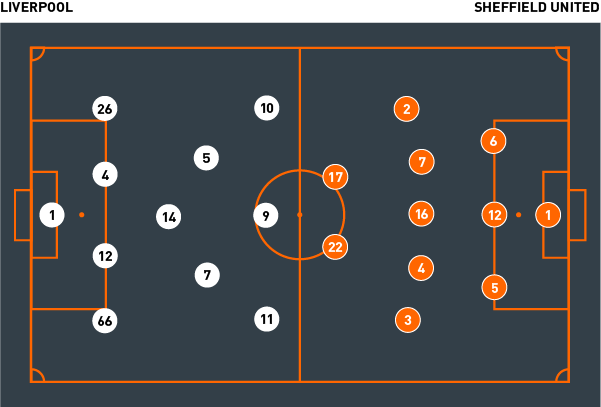 Sheffield United were organised by Chris Wilder into their familiar 3-5-2 formation, against the 4-3-3 Liverpool remained in when they were out of possession. The visitors saw little of the ball, contributing to the fact that they only had three shots on goal.