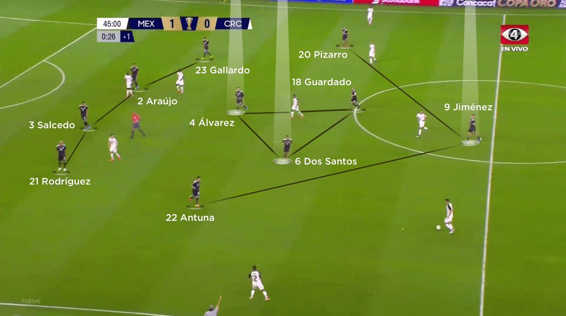 Martino's time with Mexico has so far hinted at a similar style, and has involved a high press. Their goalkeeper Guillermo Ochoa builds play from the back of their 4-3-3 or 4-2-3-1, their central defenders Carlos Salcedo and Néstor Araujo move wide, and their full-backs Luis Rodríguez and Jesús Gallardo advance. Like Busquets did at Barça, Edson Álvarez withdraws from midfield into defence to form a temporary 3-4-3 and contribute to the first line of their build, committing opponents and encouraging a switch of play before an attempt to advance through the channels via their wide players.