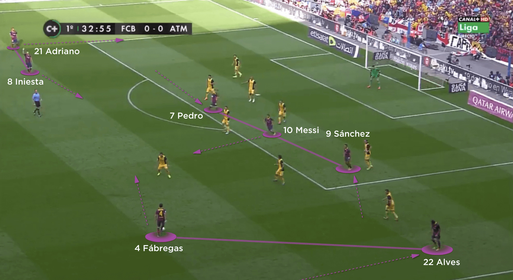 Fàbregas, like Andrés Iniesta, would also be used in a wider attacking role on the occasions Martino also wanted those at their best in the centre to, nominally, have a wide starting position, and therefore fewer rotations. If two of Neymar, Pedro and Alexis Sánchez started wide, they too would be instructed to drift infield, ensuring that Barça maintained a significant presence between the opposing full-backs and central defenders, and also that those wide forwards formed a box with the two attacking midfielders behind them. They consistently got numbers into the penalty area, runners towards both posts, and further runners targeting the spaces in behind.